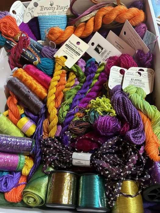 Hand dyed: Assorted threads including gimp, stranded cotton, silken straw, medium silk pearl, stranded silk, metallic thread and more.