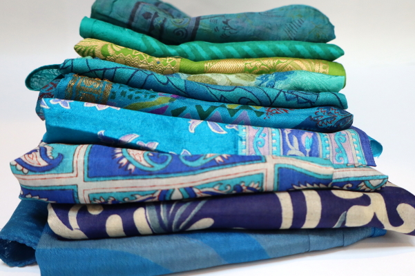 Pre-loved fabric from old saris. Sari silk can be shredded and turned into silk saree ribbon or spun into yarn. Can also be used for rag rugs, weaving rugs, jewellry, upcycled clothes, quilting and embroidery. Fabulous for nuno-felting.