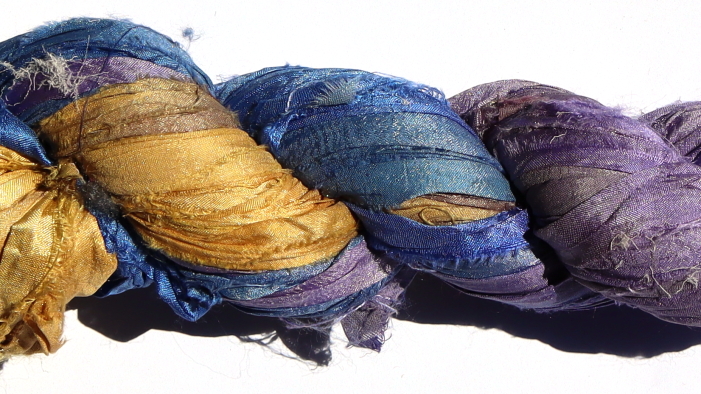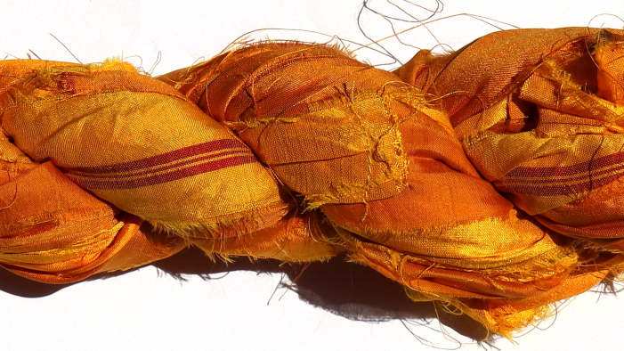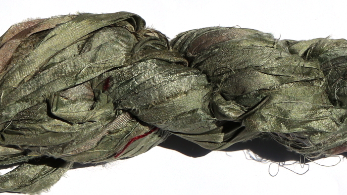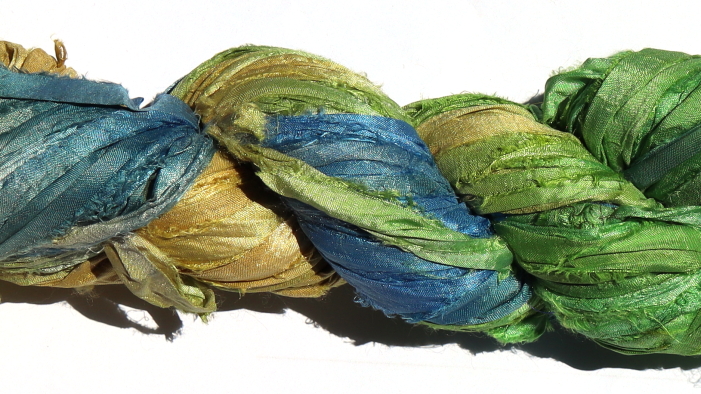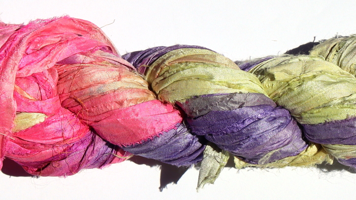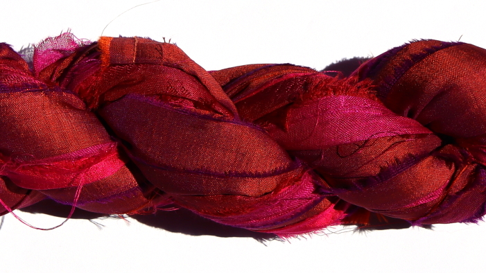 High quality pure silk hanks. 50 - 60 metres / hank. Ribbon width varies, but is approximately 2 cm.