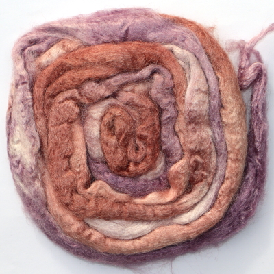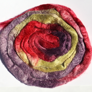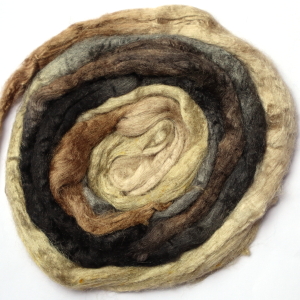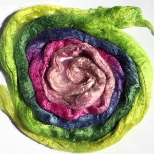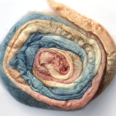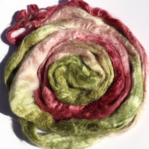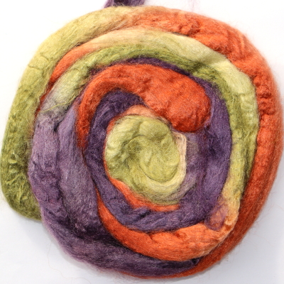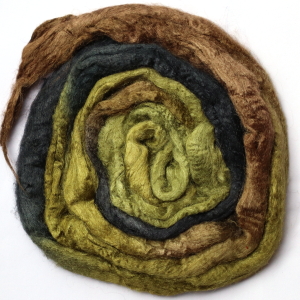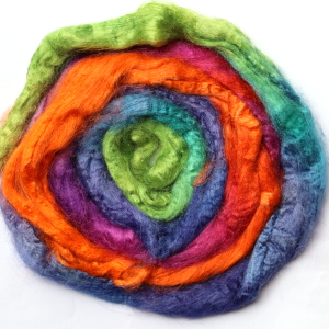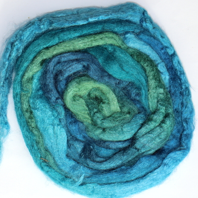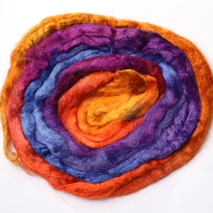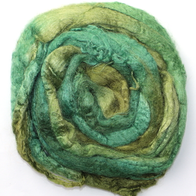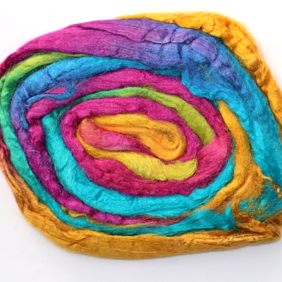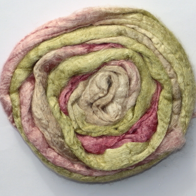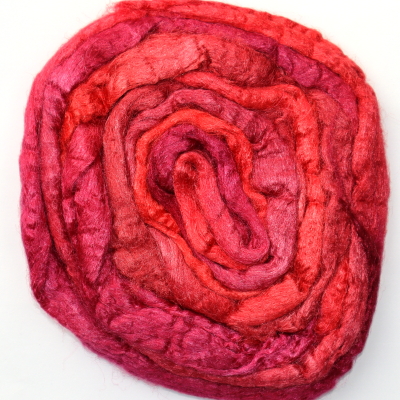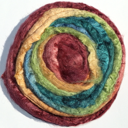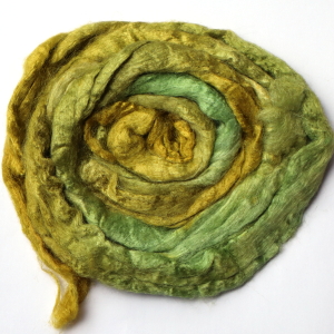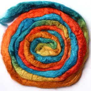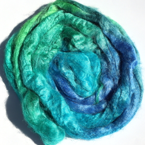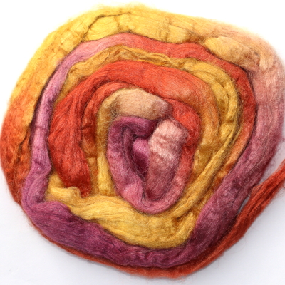 From silk worms fed on oak leaves. The tops have been both carded and combed so that all the fibres are aligned. Hand dyed in Australia.