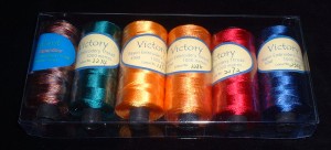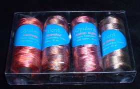 Each set consists of the a variegated, plus a plain spool of each of the colours in that variegated. Shown below is the Indian Splendour set.