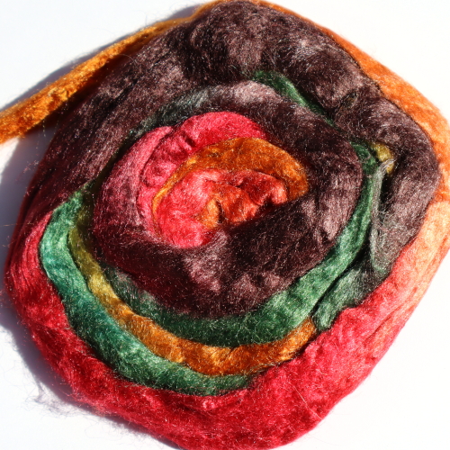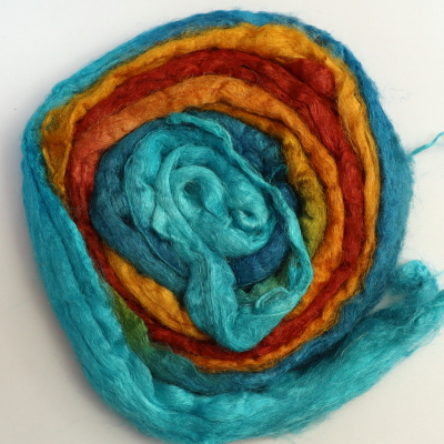 From silk worms fed on oak leaves. The tops have been both carded and combed so that all the fibres are aligned. Hand dyed in Australia.