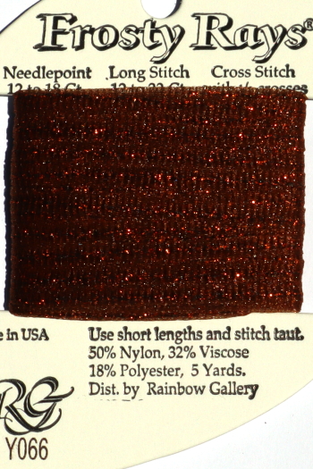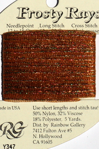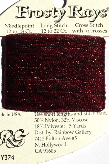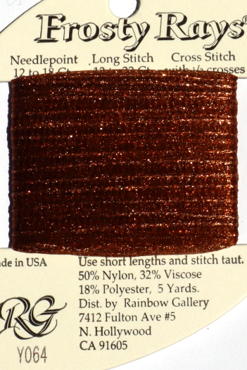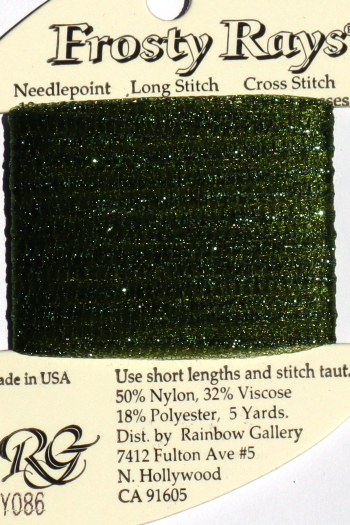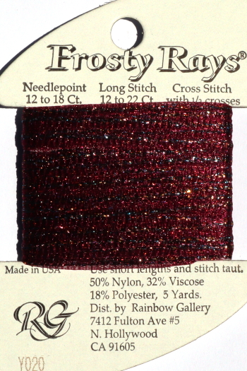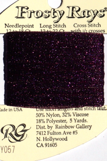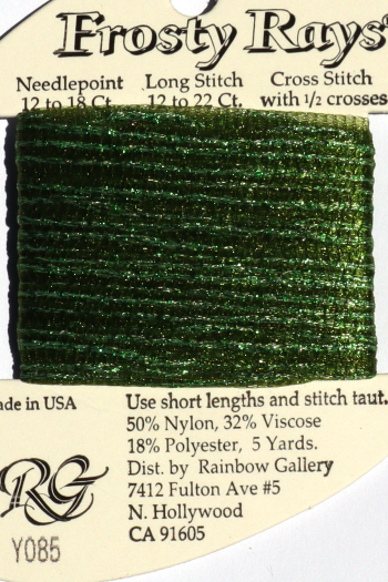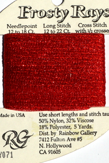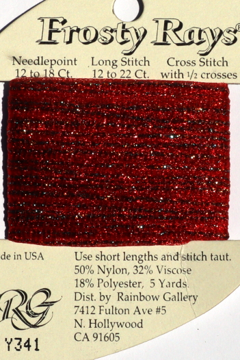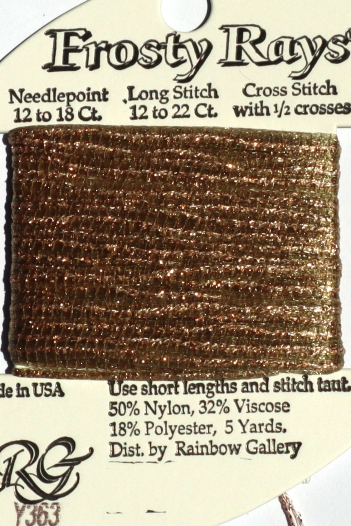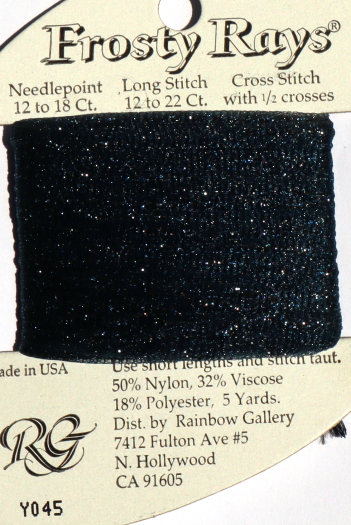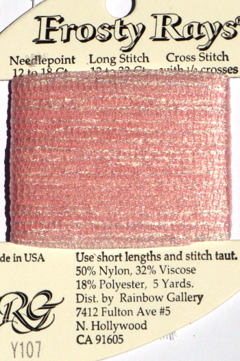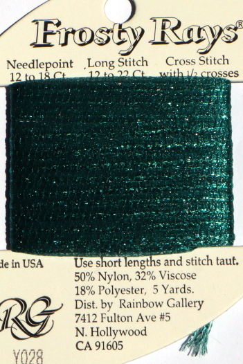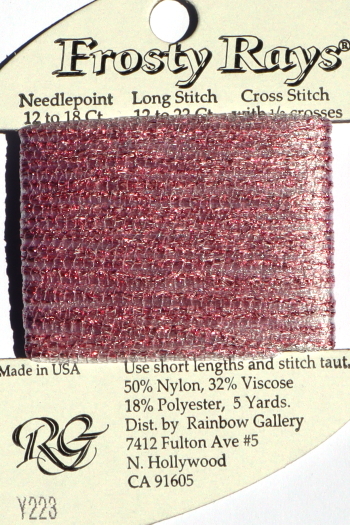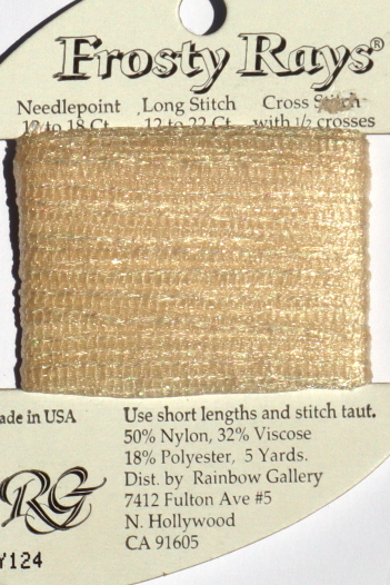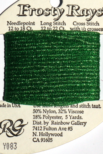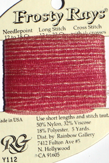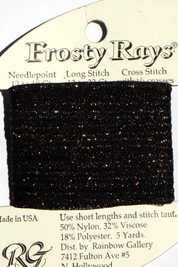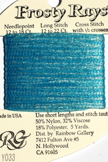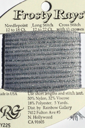 Rainbow Gallery Frosty Rays is a tubular thread with a metallic thread running through the tube. It is Nylon/Viscose/Polyester and has 4.6 metres on the card. It is great for cross stitch, canvas work, Stumpwork and Goldwork.