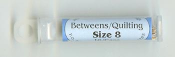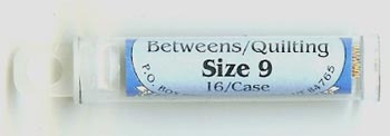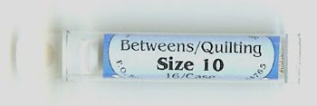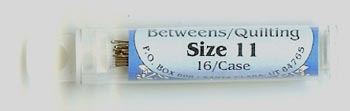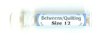 | Size 12 Between Needles The Size 12 Betweens needle is very short and very thin. Many hand quilters prefer it for getting the smallest of stitches. The eye of the Size 12 Betweens is tiny; some 100% cotton quilting threads are too large to thread through it's eye. The Size 11 Betweens needle is the same length and a little thicker than the Size 12. If the Size 12 breaks often or if is too difficult to thread, you may find the Size 11 Betweens to be a better choice. | | Size 11 Between Needles The Size 11 Betweens needle is a combination of the best characteristics of the Size 12 Between and the Size 10 Betweens needles. It is the identical length of the Size 12 Betweens needle and the same diameter of the Size 10 Betweens needle. It's length provides good control when using the "rocker" hand quilting method, and it's diameter keeps it from breaking easily. | | Size 10 Between Needles The Size 10 Betweens needle is preferred by many hand quilters. It is long enough to handle easily, and thick enough to prevent frequent breaking from the pressure of the thimble when using the "rocker" method of hand quilting. | | Size 9 Between Needles The Size 9 Betweens needle is a little longer and thicker than the Size 10 Betweens needle. | | Size 8 Between Needles The Size 8 is the longest and thickest of all of the Betweens/Quilting needles. It is appreciated for it's strength and durability. |