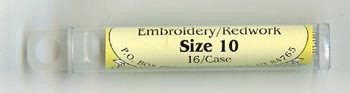 | Size 11 Embroidery / Redwork Needles (out of stock) The Size 11 Embroidery/Redwork needle is ideal for fine embroidery work. The needle's shank is not too thick yet the eye is large enough to accommodate two strands of embroidery thread. If you prefer to stitch with short needles you will enjoy using Size 11 Embroidery/Redwork needles. | | Size 10 Embroidery / Redwork Needles (out of stock) The Size 10 Embroidery/Redwork needle is ideal for fine embroidery work. It is a little longer than the Size 11. The needle's shank is not too thick, yet the eye is large enough to accommodate three strands of embroidery thread. It is the favored size for Redwork embroidery. | | Size 9 Embroidery / Redwork Needles The Size 9 Embroidery/Redwork needle is ideal for all types of embroidery work. If you prefer stitching with a long needle, you will enjoy the Size 9. It is Jeana's preferred needle for embroidery. | | Size 8 Embroidery / Redwork Needles (out of stock) The Size 8 Embroidery/Redwork needle is ideal for all types of embroidery work. If you prefer stitching with a long needle, you will enjoy the Size 8. It is longer and a bit thicker than the Size 9 Embroidery/Redwork needle. | | Size 7 Embroidery / Redwork Needles The Size 7 Embroidery/Wool Needle is the longest of all the Embroidery needles. Because of its extra length, the Size 7 is excellent for wool applique. It reaches effortlessly through several layers of wool for ease of stitching. |